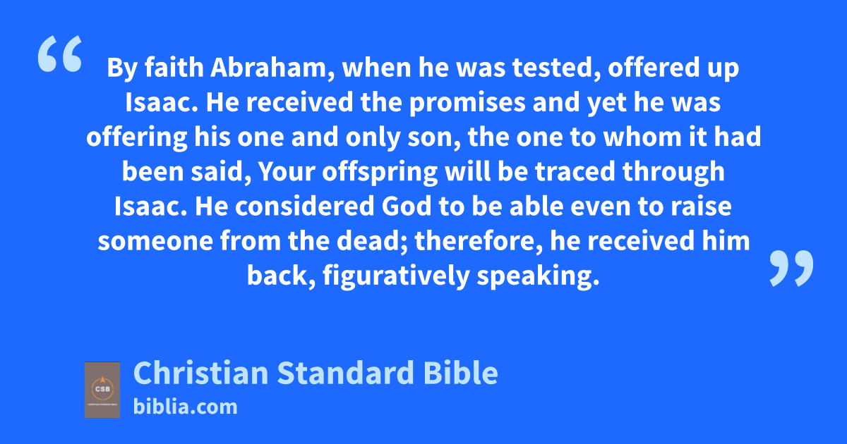 17 By faith Abraham, when he was tested, offered up Isaac.m He received the promises and yet he was offering his one and only son, 18 the one to whom it had been said, Your offspringA will be traced through Isaac.B,n 19 He considered God to be able even to raise someone from the dead;o therefore, he received him back, figuratively speaking.C