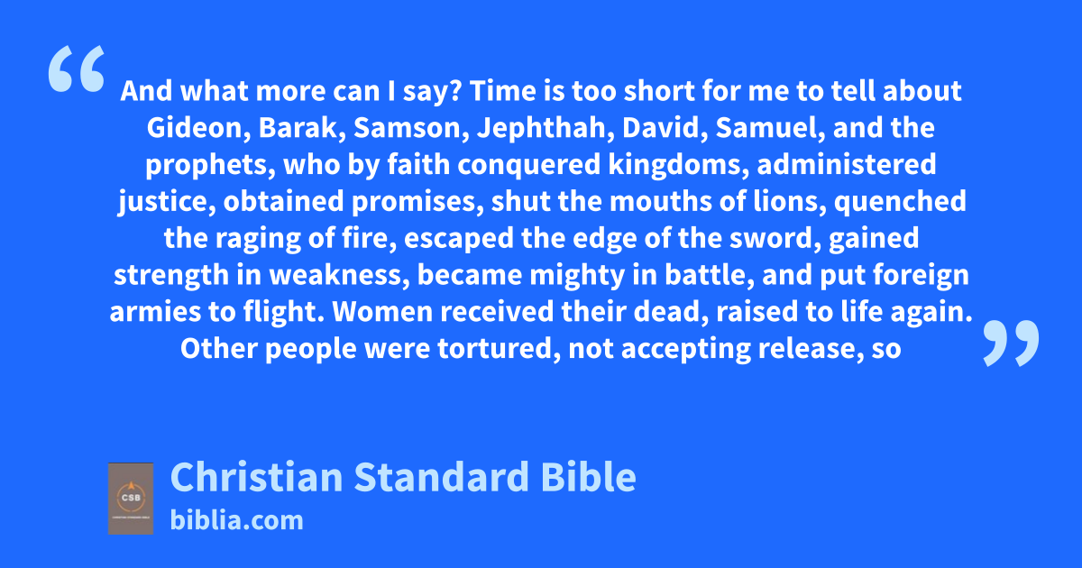 32 And what more can I say? Time is too short for me to tell about Gideon, Barak, Samson, Jephthah,y David, Samuel, and the prophets,z 33 who by faith conquered kingdoms,aa administered justice, obtained promises, shut the mouths of lions,ab 34 quenched the raging of fire, escaped the edge of the sword, gained strength in weakness, became mighty in battle, and put foreign armies to flight.a 35 Women received their dead, raised to life again. Other people were tortured, not accepting release, so that they might gain a better resurrection. 36 Others experienced mockings and scourgings, as well as bonds and imprisonment.b 37 They were stoned,F,c they were sawed in two, they died by the sword, they wandered about in sheepskins, in goatskins,d destitute, afflicted, and mistreated. 38 The world was not worthy of them. They wandered in deserts and on mountains, hiding in caves and holes in the ground.
