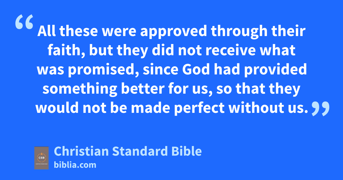 39 All these were approved through their faith, but they did not receive what was promised, 40 since God had provided something better for us, so that they would not be made perfect without us.e