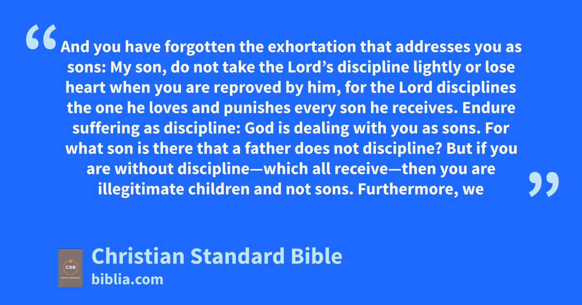 7 Endure suffering as discipline: God is dealing with you as sons. For what son is there that a father does not discipline? 8 But if you are without discipline—which all receiveE—then you are illegitimate children and not sons.k 9 Furthermore, we had human fathers discipline us, and we respected them. Shouldn’t we submit even more to the Father of spirits and live?l 10 For they disciplined us for a short time based on what seemed good to them, but he does it for our benefit, so that we can share his holiness.m 11 No discipline seems enjoyable at the time, but painful. Later on, however, it yields the peaceful fruitn of righteousness to those who have been trained by it.o