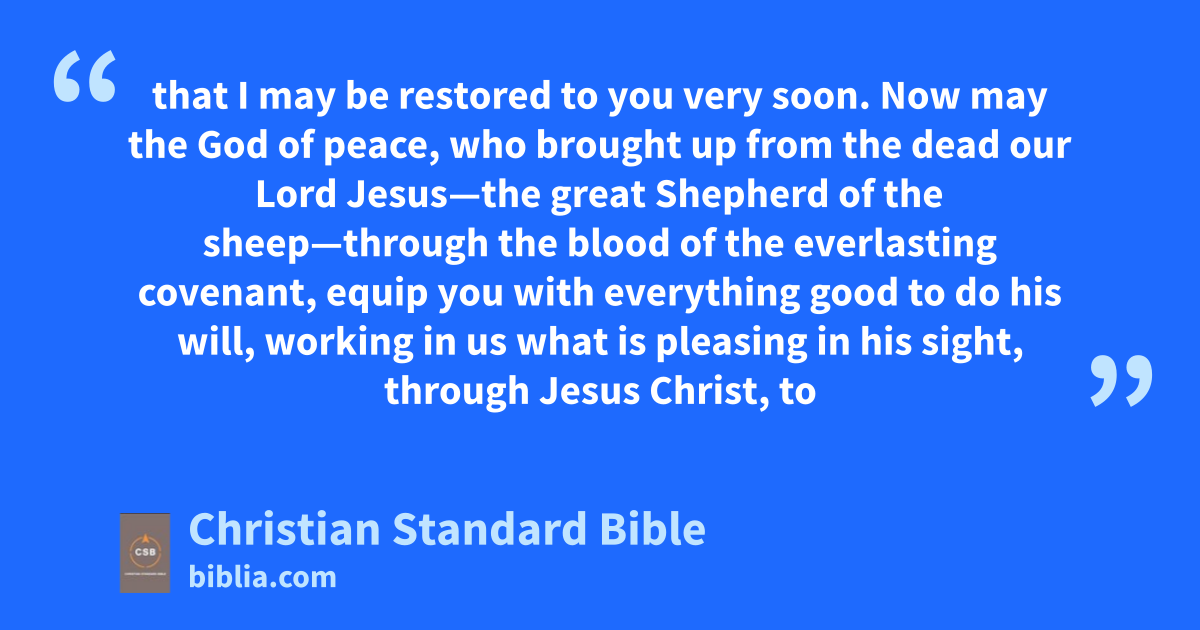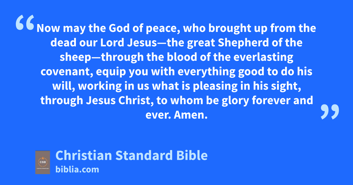 20 Now may the God of peace, who brought up from the dead our Lord Jesus—the great Shepherd of the sheepw—through the blood of the everlasting covenant,x 21 equipD you with everything good to do his will, working in us what is pleasing in his sight, through Jesus Christ, to whom be glory forever and ever.E,y Amen.
