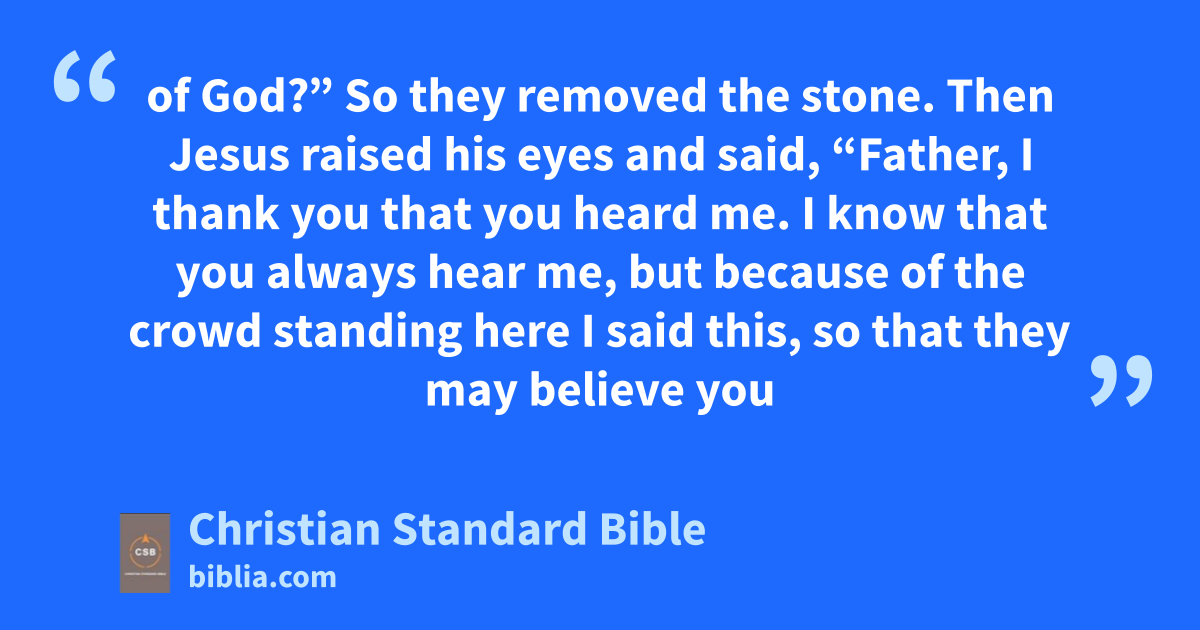 41 So they removed the stone. Then Jesus raised his eyes and said, “Father, I thankab you that you heard me.ac 42 I know that you always hear me, but because of the crowd standing here I said this, so that they may believe you sentad me.” 43 After he said this, he shouted with a loud voice, “Lazarus, come out!” 44 The dead man came out bound hand and foot with linen strips and with his face wrapped in a cloth. Jesus said to them, “Unwrap him and let him go.”
