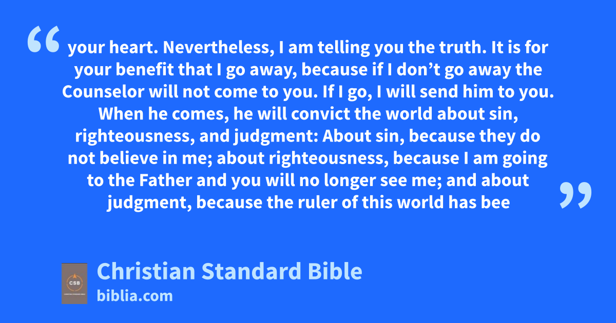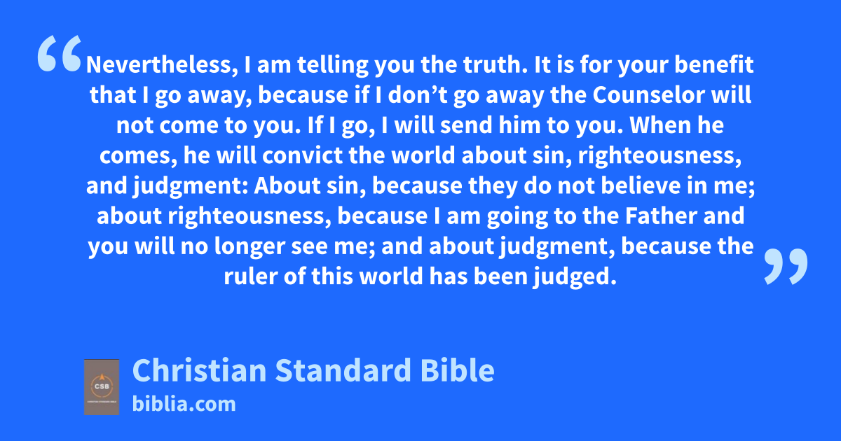 16 “I have told you these things to keep you from stumbling. 2 They will ban you from the synagogues.ad In fact, a time is coming when anyone who kills you will think he is offering serviceae to God. 3 They will do these things because they haven’t knownaf the Father or me. 4 But I have told you these things so that when their timeB comes you will rememberag I told them to you. I didn’t tell you these things from the beginning, because I was with you. 5 But now I am going awayah to him who sent me, and not one of you asks me, ‘Where are you going?’ai 6 Yet, because I have spoken these things to you, sorrow has filled your heart. 7 Nevertheless, I am telling you the truth.aj It is for your benefit that I go away, because if I don’t go away the Counselor will not come to you. If I go, I will send him to you.ak 8 When he comes, he will convict the world about sin, righteousness, and judgment: 9 About sin, because they do not believe in me; 10 about righteousness, because I am going to the Fatheral and you will no longer see me; 11 and about judgment,am because the ruler of this worldan has been judged.ao
