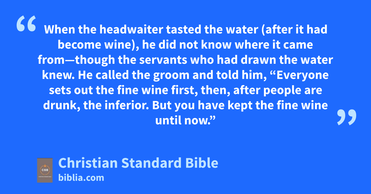 9 When the headwaiter tasted the water (after it had become wine), he did not know where it came from—though the servants who had drawn the water knew. He called the groom 10 and told him, “Everyone sets out the fine wine first, then, after people are drunk, the inferior. But you have kept the fine wine until now.”