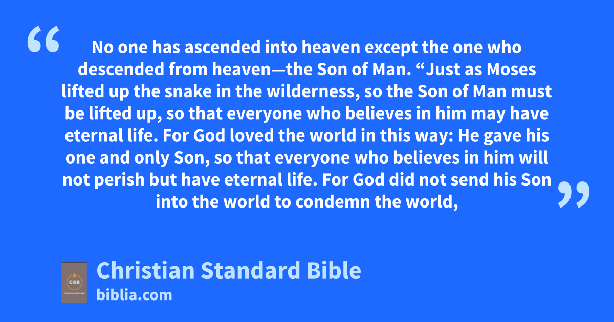14 “Just as Mosesag lifted up the snake in the wilderness,ah so the Son of Man must be lifted up, 15 so that everyone who believes in him mayD have eternal life.ai 16 For God lovedaj the world in this way:E He gaveF his one and onlyak Son,al so that everyone who believes in him will not perish but have eternal life.am 17 For God did not send his Son into the world to condemnan the world, but to save the world through him. 18 Anyone who believes in him is not condemned, but anyone who does not believe is already condemned,ao because he has not believed in the nameap of the one and only Sonaq of God. 19 This is the judgment: The lightar has come into the world,as and people loved darkness rather than the light because their deeds were evil. 20 For everyone who does evil hatesat the light and avoids it,G so that his deedsau may not be exposed. 21 But anyone who lives byH the truth comes to the light, so that his worksav may be shown to be accomplished by God.”