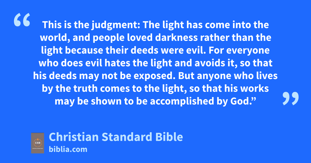 14 “Just as Mosesag lifted up the snake in the wilderness,ah so the Son of Man must be lifted up, 15 so that everyone who believes in him mayD have eternal life.ai 16 For God lovedaj the world in this way:E He gaveF his one and onlyak Son,al so that everyone who believes in him will not perish but have eternal life.am 17 For God did not send his Son into the world to condemnan the world, but to save the world through him. 18 Anyone who believes in him is not condemned, but anyone who does not believe is already condemned,ao because he has not believed in the nameap of the one and only Sonaq of God. 19 This is the judgment: The lightar has come into the world,as and people loved darkness rather than the light because their deeds were evil. 20 For everyone who does evil hatesat the light and avoids it,G so that his deedsau may not be exposed. 21 But anyone who lives byH the truth comes to the light, so that his worksav may be shown to be accomplished by God.”