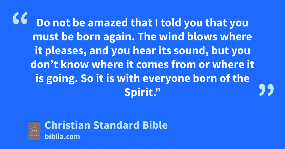 5 Jesus answered, “Truly I tell you, unless someone is bornu of water and the Spirit,v he cannot enter the kingdom of God. 6 Whatever is born of the fleshw is flesh, and whatever is born of the Spiritx is spirit. 7 Do not be amazed that I told you that you must be borny again. 8 The wind blows where it pleases, and you hear its sound, but you don’t know where it comes from or where it is going.z So it is with everyone born of the Spirit.”aa