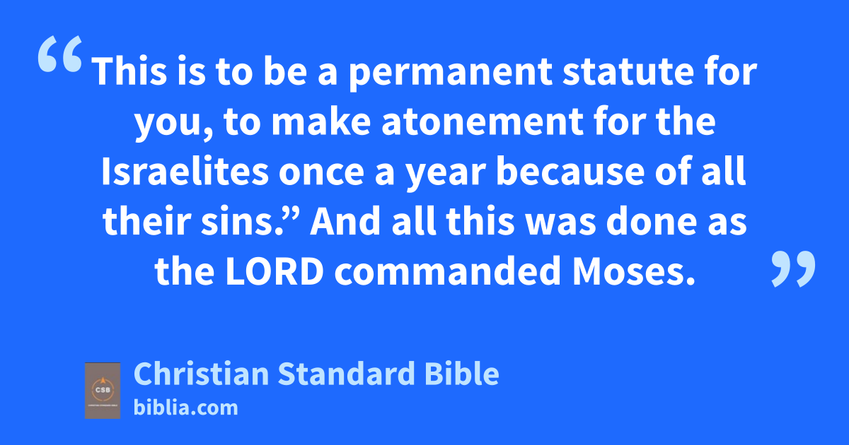 29 “This is to be a permanent statutez for you: In the seventh month, on the tenth day of the month you are to practice self-denialaa and do no work,ab both the native and the alienac who resides among you. 30 Atonement will be made for you on this day to cleanse you,ad and you will be clean from all your sins before the Lord. 31 It is a Sabbathae of complete rest for you,af and you must practice self-denial; it is a permanent statute. 32 The priest who is anointed and ordainedA,ag to serve as high priestah in place of his father will make atonement. He will put on the linen garments, the holy garments, 33 and make atonement for the most holy place. He will make atonement for the tent of meeting and the altar and will make atonement for the priests and all the people of the assembly. 34 This is to be a permanent statute for you, to make atonement for the Israelites once a yearai because of all their sins.” And all this was done as the Lord commanded Moses.