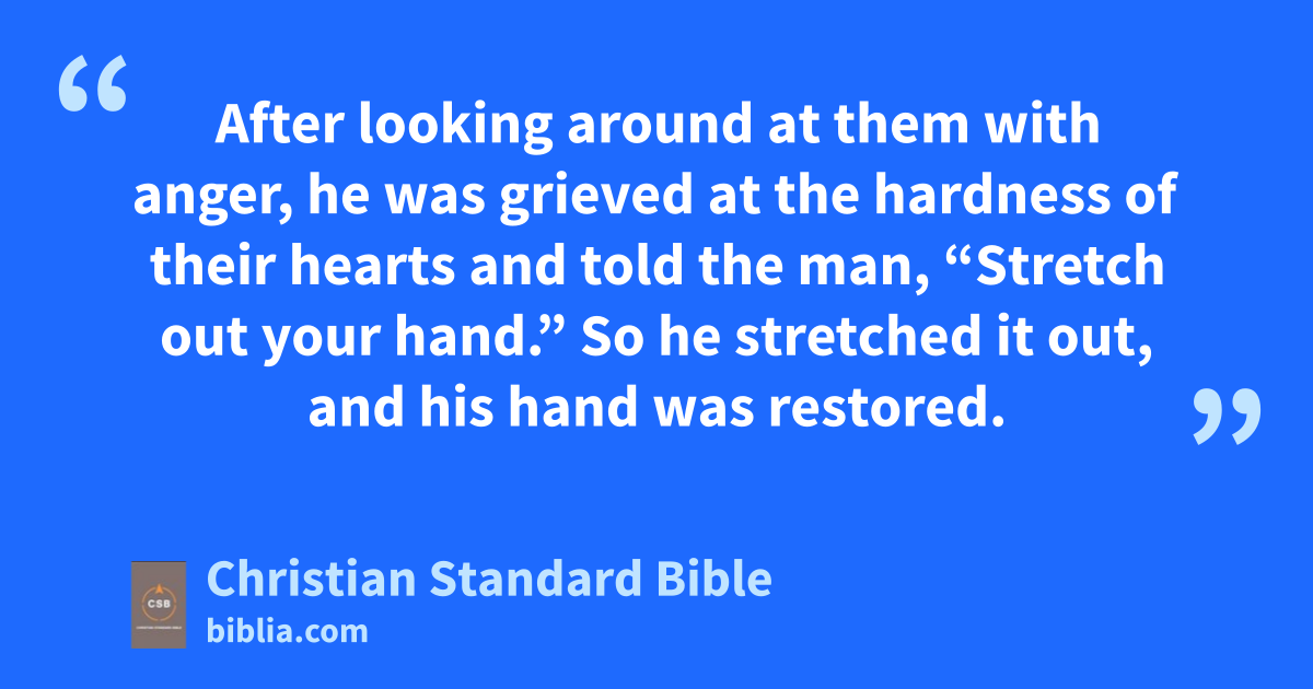 3 Jesusaj entered the synagogueak again, and a man was there who had a shriveledal hand. 2 In order to accuseam him, they were watching him closelyan to see whether he would healao him on the Sabbath.ap 3 He told the man with the shriveled hand, “Stand before us.” 4 Then he said to them, “Is it lawfulaq to do goodar on the Sabbath or to do evil,as to save lifeat or to kill?”au But they were silent.av 5 After looking around at them with anger,aw he was grieved at the hardnessax of their hearts and told the man, “Stretch out your hand.” So he stretched it out, and his hand was restored.ay 6 Immediately the Phariseesaz went out and started plottingba with the Herodiansbb against him, how they might killbc him.