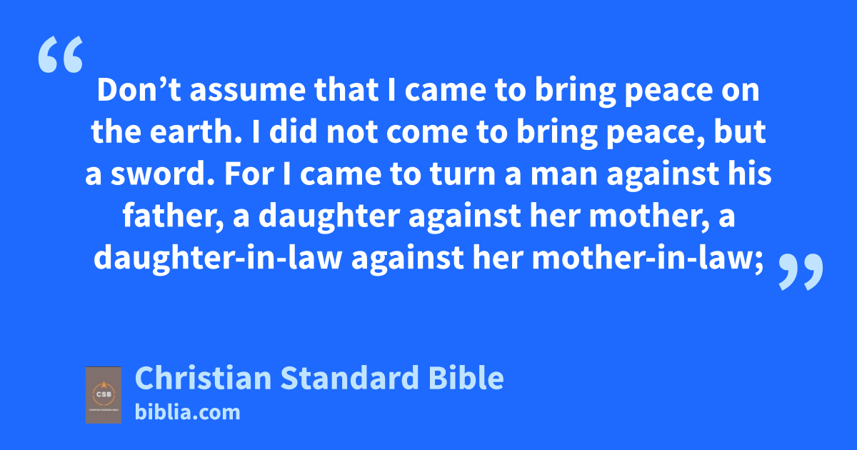 32 “Therefore, everyone who will acknowledge me before others, I will also acknowledge him before my Father in heaven.u 33 But whoever denies me before others,v I will also deny him before my Father in heaven. 34 Don’t assume that I came to bring peace on the earth. I did not come to bring peace, but a sword.w 35 For I came to turn