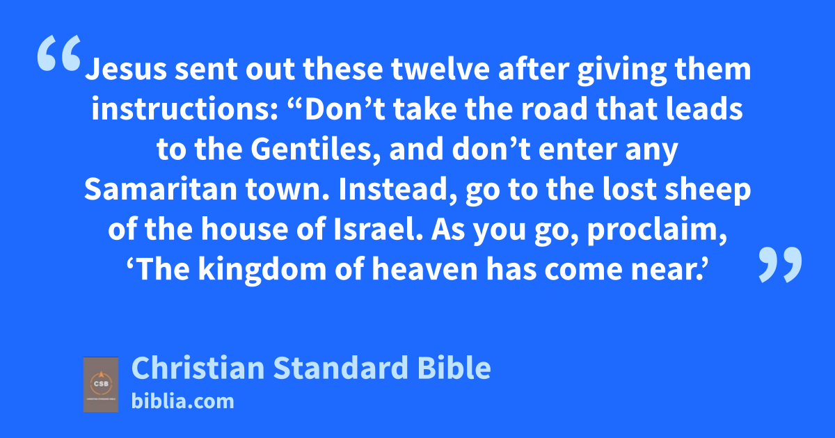 5 Jesus sent out these twelve after giving them instructions: “Don’t take the road that leads to the Gentiles, and don’t enter any Samaritanx town. 6 Instead, go to the lost sheepy of the house of Israel.z 7 As you go, proclaim, ‘The kingdom of heaven has come near.’aa 8 Heal the sick, raise the dead, cleanse those with leprosy,* drive out demons.ab Freely you received, freely give. 9 Don’t acquire gold, silver, or copper for your money-belts.ac 10 Don’t take a traveling bag for the road, or an extra shirt, sandals, or a staff, for the workerad is worthy of his food. 11 When you enter any town or village, find out who is worthy, and stay there until you leave. 12 Greet a household when you enter it,ae 13 and if the household is worthy, let your peace be on it; but if it is unworthy, let your peace return to you.af 14 If anyone does not welcome you or listen to your words, shake the dust off your feetag when you leave that house or town. 15 Truly I tell you, it will be more tolerable on the day of judgmentah for the land of Sodom and Gomorrah than for that town.ai