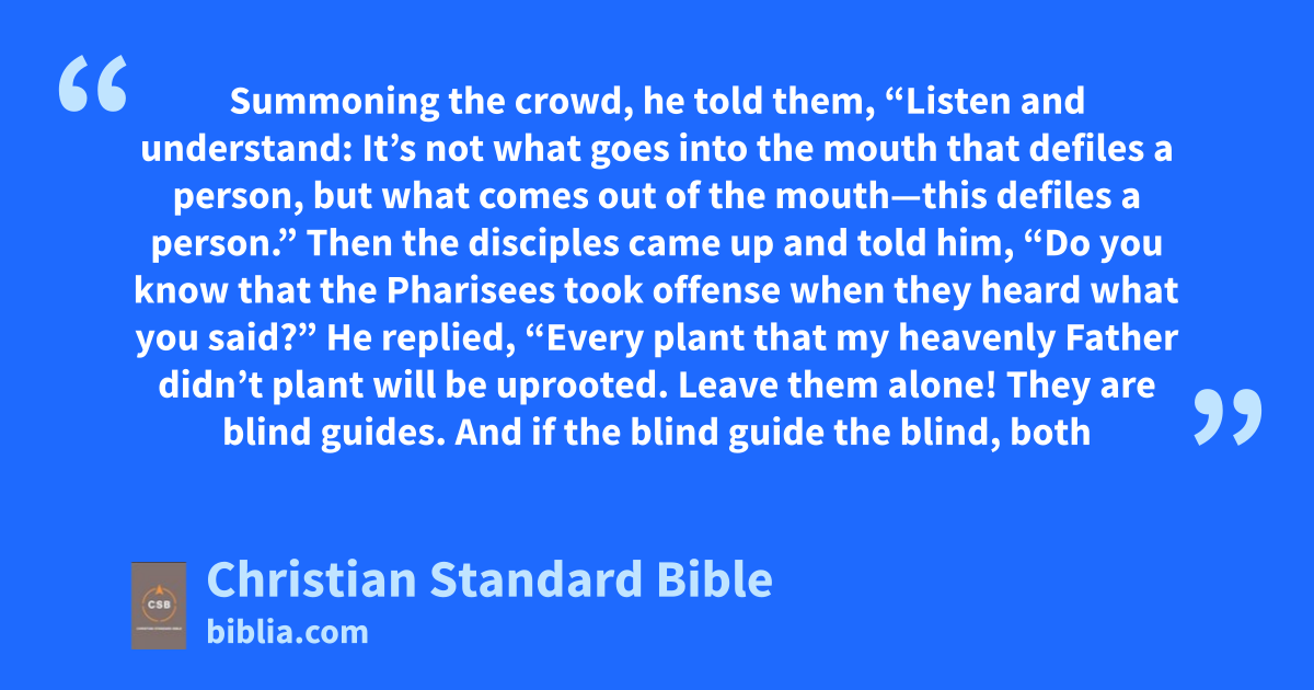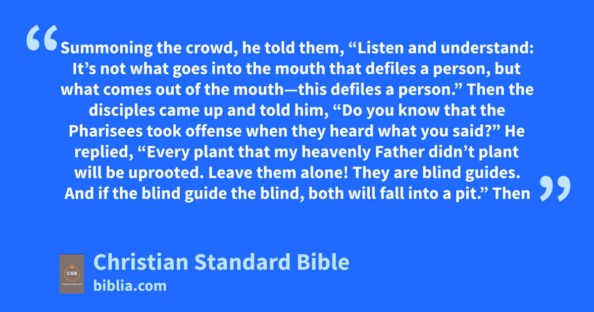 10 Summoning the crowd, he told them, “Listen and understand: 11 It’s not what goes into the mouth that defilese a person, but what comes out of the mouth—this defiles a person.”f