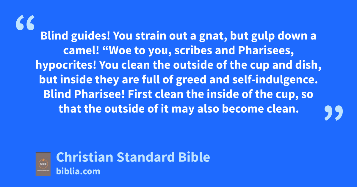 25 “Woe to you, scribes and Pharisees, hypocrites! You clean the outside of the cup and dish, but inside they are full of greedA and self-indulgence.a 26 Blind Pharisee! First clean the inside of the cup,B so that the outside of itC may also become clean.