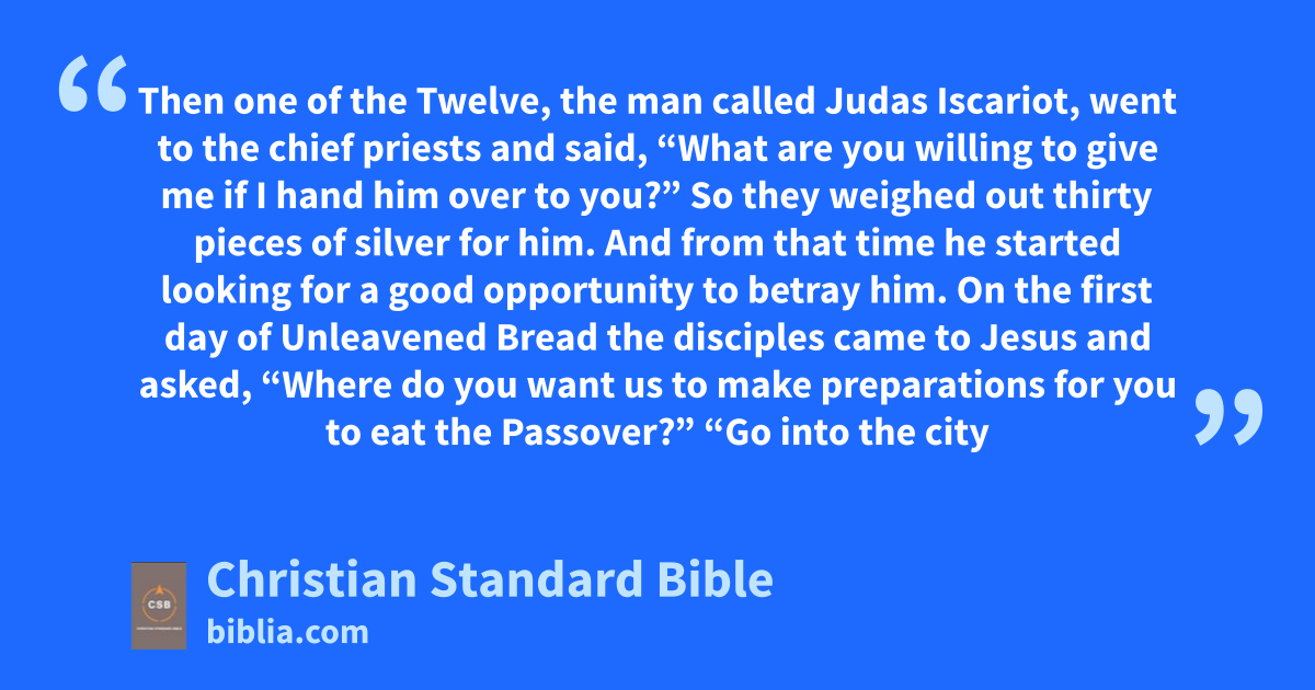 14 Thenk one of the Twelve, the man called Judas Iscariot, went to the chief priestsl 15 and said, “What are you willing to give me if I hand him over to you?” So they weighed out thirty pieces of silver for him.m 16 And from that time he started looking for a good opportunity to betray him.