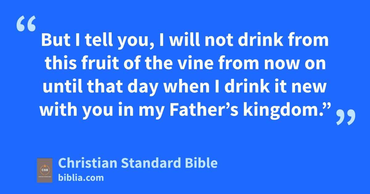 26 As they were eating,s Jesus took bread, blessed and broke it, gave it to the disciples,t and said, “Take and eat it; this is my body.”u 27 Then he took a cup, and after giving thanks, he gave it to them and said, “Drink from it, all of you. 28 For this is my blood of the covenant,B which is poured out for many for the forgiveness of sins.v 29 But I tell you, I will not drink from this fruit of the vine from now on until that day when I drink it new with you in my Father’s kingdom.”w 30 After singing a hymn, they went out to the Mount of Olives.x