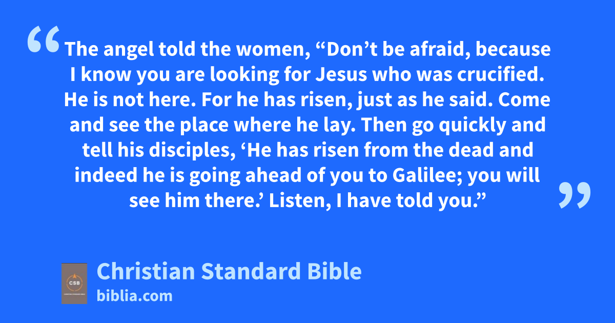 5 The angel told the women, “Don’t be afraid, because I know you are looking for Jesus who was crucified.c 6 He is not here. For he has risen, just as he said. Come and see the place where he lay.d 7 Then go quickly and tell his disciples,e ‘He has risen from the dead and indeed he is going ahead of you to Galilee; you will see him there.’ Listen, I have told you.”f