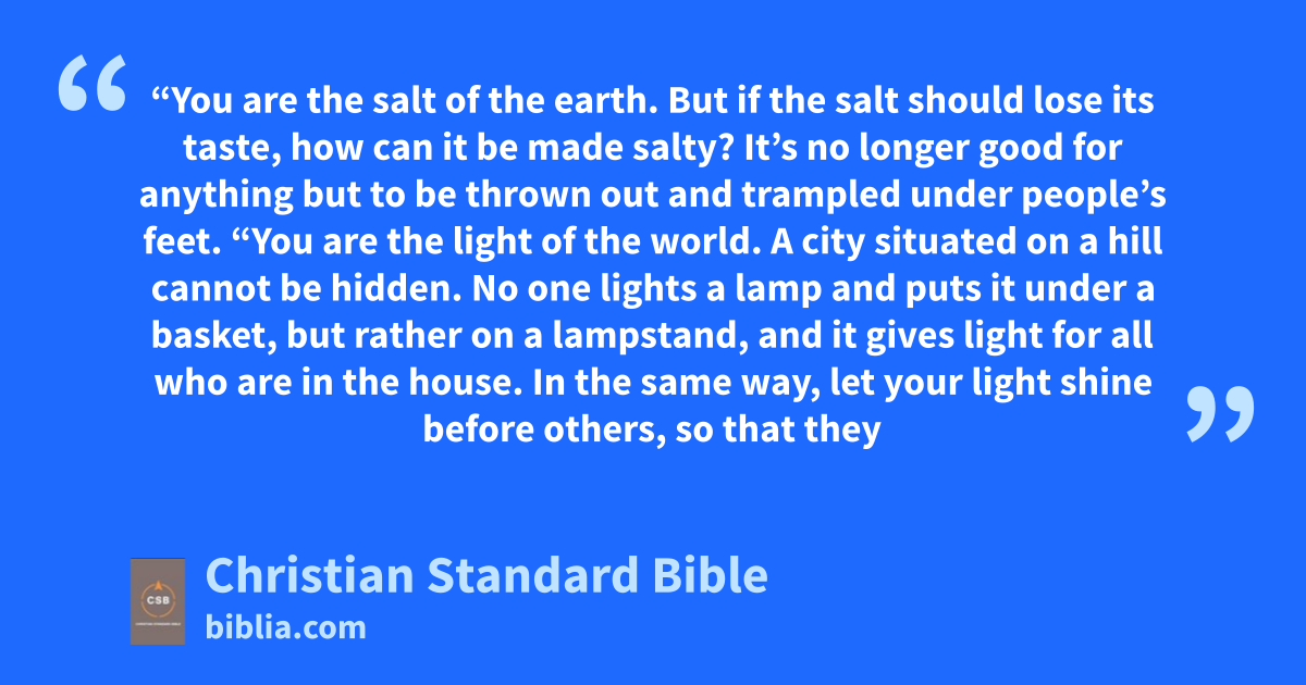 14 “You are the light of the world. A city situated on a hill cannot be hidden.t 15 No one lights a lampu and puts it under a basket, but rather on a lampstand, and it gives light for all who are in the house.v 16 In the same way, let your light shine before others, so that they may see your good works and give glory to your Father in heaven.w