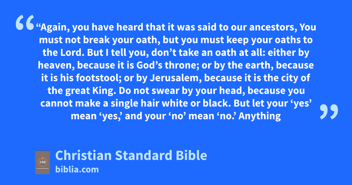 33 “Again, you have heard that it was said to our ancestors, You must not break your oath, but you must keep your oaths to the Lord.B,h 34 But I tell you, don’t take an oath at all: either by heaven, because it is God’s throne; 35 or by the earth, because it is his footstool; or by Jerusalem, because it is the city of the great King.i 36 Do not swear by your head, because you cannot make a single hair white or black. 37 But let your ‘yes’ mean ‘yes,’ and your ‘no’ mean ‘no.’ Anything more than this is from the evil one.j