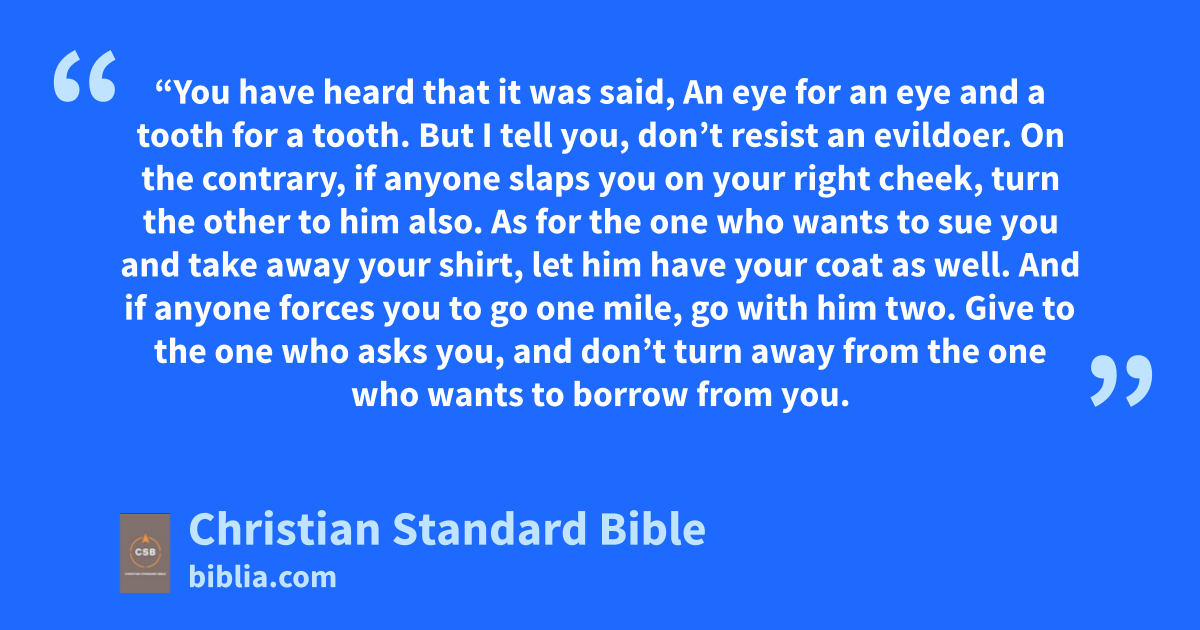 38 “You have heard that it was said, An eye for an eye and a tooth for a tooth.C,k 39 But I tell you, don’t resistD an evildoer. On the contrary, if anyone slaps you on your right cheek, turn the other to him also.l 40 As for the one who wants to sue you and take away your shirt, let him have your coat as well. 41 And if anyone forces you to go one mile, go with him two. 42 Give to the one who asks you, and don’t turn away from the one who wants to borrow from you.m
