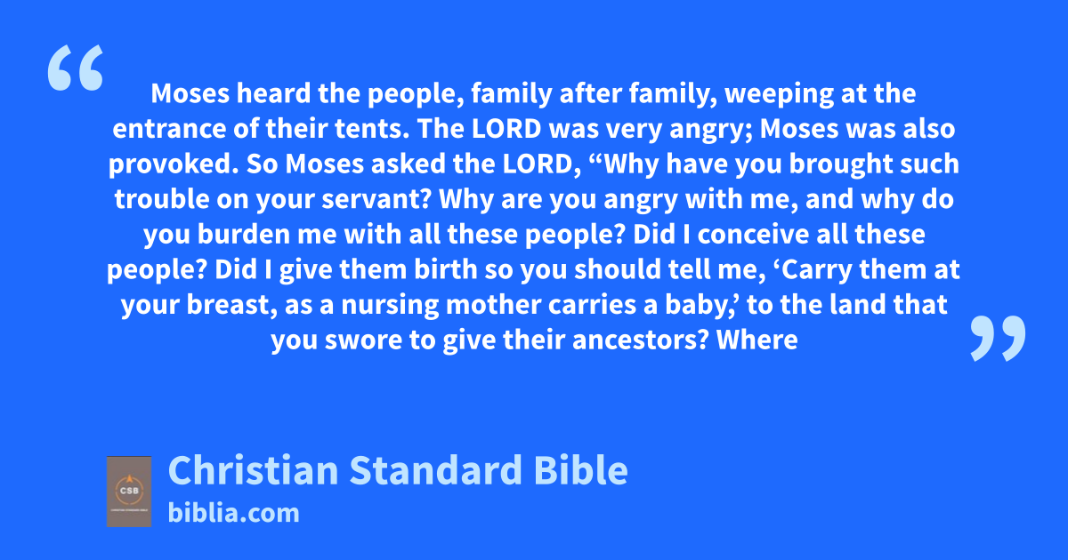 10 Moses heard the people, family after family, weeping at the entrance of their tents. The Lord was very angry;a Moses was also provoked.D 11 So Moses asked the Lord, “Why have you brought such trouble on your servant? Why are you angry with me,E and why do you burden me with all these people?b 12 Did I conceive all these people? Did I give them birth so you should tell me, ‘Carry them at your breast, as a nursing mother carries a baby,’c to the land that you swore to give their ancestors?d 13 Where can I get meat to give all these people? For they are weeping to me, ‘Give us meat to eat!’ 14 I can’t carry all these people by myself. They are too much for me. 15 If you are going to treat me like this, please kill me right nowe if I have found favor with you, andf don’t let me see my miseryF anymore.”