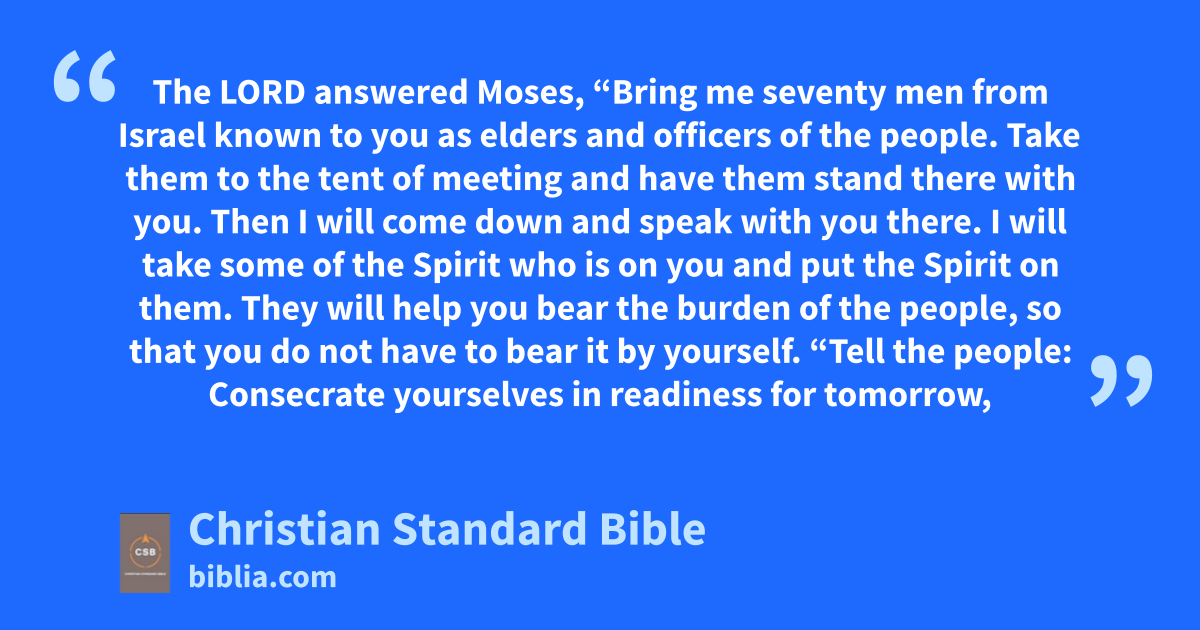 16 The Lord answered Moses, “Bring me seventy men from Israel known to you as elders and officers of the people. Take them to the tent of meeting and have them stand there with you. 17 Then I will come down and speak with you there. I will take some of the Spirit who is on you and put the Spirit on them.g They will help you bear the burden of the people, so that you do not have to bear it by yourself.h