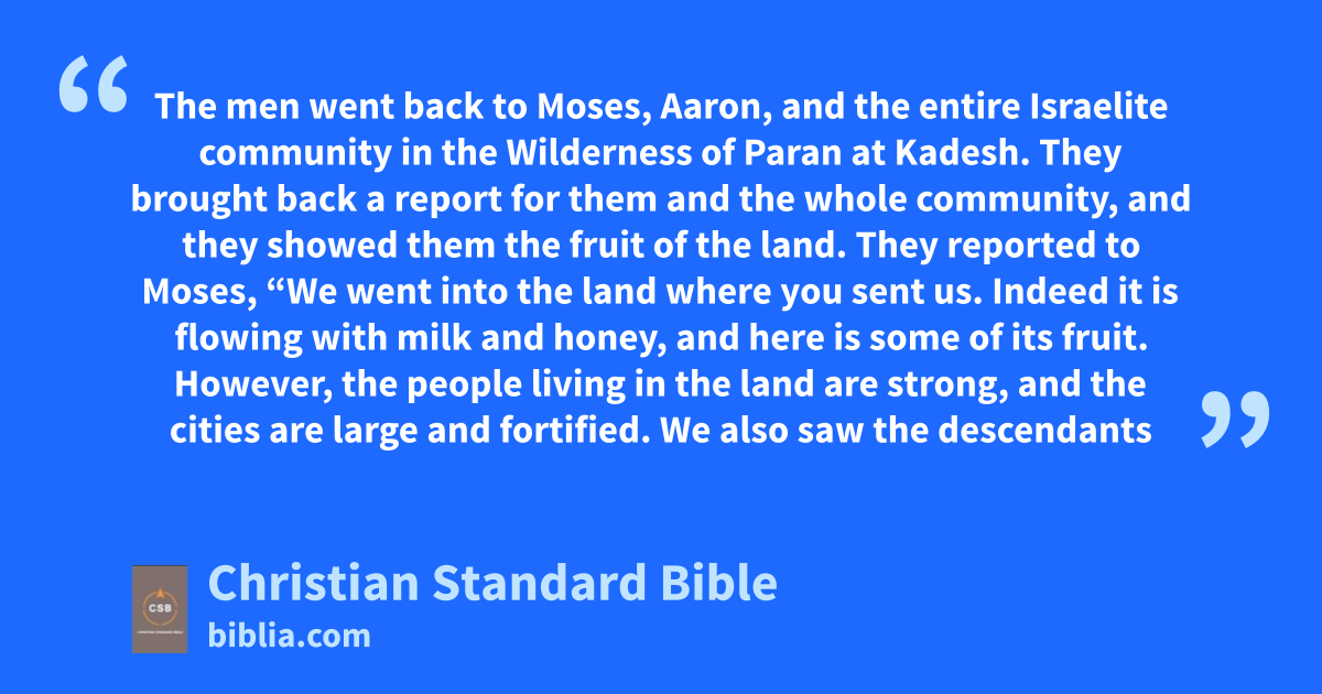 26 The men went back to Moses, Aaron, and the entire Israelite community in the Wilderness of Paran at Kadesh. They brought back a report for them and the whole community, and they showed them the fruit of the land.b 27 They reported to Moses, “We went into the land where you sent us. Indeed it is flowing with milk and honey,c and here is some of its fruit. 28 However, the people living in the land are strong, and the cities are large and fortified.d We also saw the descendants of Anake there. 29 The Amalekitesf are living in the land of the Negev; the Hethites, Jebusites, and Amorites live in the hill country; and the Canaanites live by the sea and along the Jordan.”