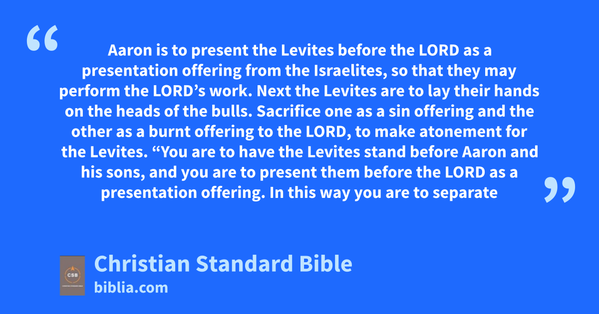 8 “They are to take a young bull and its grain offering of fine flour mixed with oil, and you are to take a second young bull for a sin offering. 9 Bring the Levites before the tent of meeting and assemble the entire Israelite community.h 10 Then present the Levites before the Lord, and have the Israelites lay their hands on them. 11 Aaron is to present the Levites before the Lord as a presentation offering from the Israelites, so that they may perform the Lord’s work.i 12 Next the Levites are to lay their hands on the heads of the bulls. Sacrifice one as a sin offering and the other as a burnt offering to the Lord, to make atonement for the Levites.j