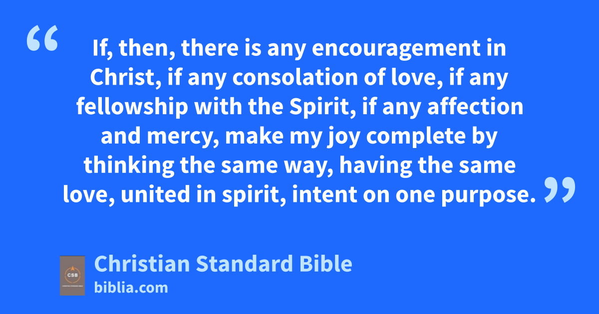 2 If, then, there is any encouragement in Christ, if any consolation of love,a if any fellowship with the Spirit,b if any affection and mercy,c 2 make my joy complete by thinking the same way,d having the same love,e united in spirit, intent on onef purpose. 3 Do nothing out of selfish ambitiong or conceit,h but in humilityi consider others as more importantj than yourselves. 4 Everyone should look not to his own interests,k but rather to the interests of others.l