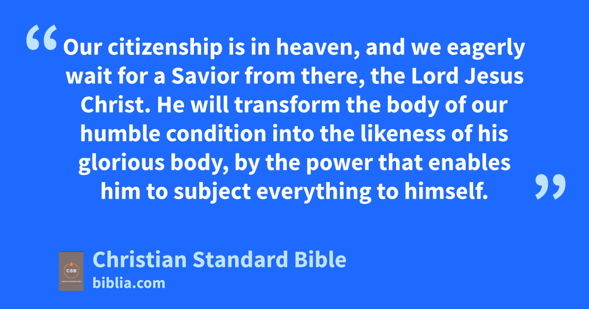 12 Not that I have already reached the goal or am already perfect, but I make every effort to take holdo of it because I also have been taken hold of by Christ Jesus. 13 Brothers and sisters, I do notA consider myself to have taken hold of it. But one thing I do: Forgetting what is behindp and reaching forward to what is ahead, 14 I pursue as my goal the prize promised by God’s heavenlyB call in Christ Jesus.q 15 Therefore, let all of us who are mature think this way. And if you think differently about anything, God will revealr this also to you. 16 In any case, we should live up to whatever truth we have attained. 17 Join in imitating me, brothers and sisters, and pay careful attention to those who live according to the example you have in us. 18 For I have often told you, and now say again with tears, that many live as enemies of the crosss of Christ. 19 Their end is destruction; their god is their stomach; their gloryt is in their shame; and they are focused on earthly things, 20 Our citizenship is in heaven, and we eagerly wait for a Savior from there, the Lord Jesus Christ. 21 He will transform the body of our humble condition into the likeness of his gloriousu body,v by the power that enables him to subject everything to himself.