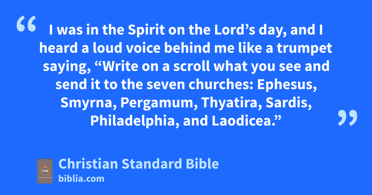9 I, John, your brother and partner in the affliction,t kingdom,u and endurancev that are in Jesus, was on the island called Patmos because of the word of God and the testimony of Jesus.w 10 I was in the SpiritN,x on the Lord’s day, and I heard a loud voice behind me like a trumpety 11 saying, “Writez on a scrollO what you see and send it to the seven churches: Ephesus, Smyrna, Pergamum, Thyatira, Sardis, Philadelphia, and Laodicea.”