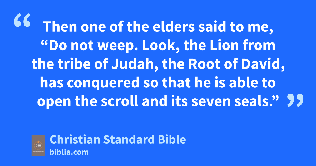 5 Then I saw in the right hand of the one seated on the throne a scroll with writing on both sides, sealed with seven seals.l 2 I also saw a mighty angelm proclaiming with a loud voice, “Who is worthy to open the scroll and break its seals?” 3 But no one in heaven or on earth or under the earth was able to open the scroll or even to look in it. 4 I wept and wept because no one was found worthy to openD the scroll or even to look in it. 5 Then one of the elders said to me, “Do not weep. Look, the Lion from the tribe of Judah,n the Root of David,o has conqueredp so that he is able to open the scroll andE its seven seals.”