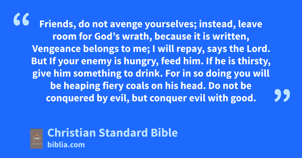 9 Let love be without hypocrisy.s Detest evil;t cling to what is good. 10 Love one another deeply as brothers and sisters.u Take the lead in honoring one another.v 11 Do not lack diligence in zeal; be fervent in the Spirit;B,w serve the Lord.x 12 Rejoice in hope;y be patient in affliction;z be persistent in prayer.aa 13 Share with the saints in their needs;ab pursue hospitality.ac 14 Bless those who persecute you;ad bless and do not curse. 15 Rejoice with those who rejoice;ae weep with those who weep. 16 Live in harmony with one another.af Do not be proud;ag instead, associate with the humble. Do not be wise in your own estimation.ah 17 Do not repay anyone evil for evil.ai Give careful thought to do what is honorableaj in everyone’s eyes. 18 If possible, as far as it depends on you, live at peace with everyone.ak 19 Friends, do not avenge yourselves; instead, leave room for God’s wrath, because it is written, Vengeance belongs to me; I will repay,C,al says the Lord. 20 But