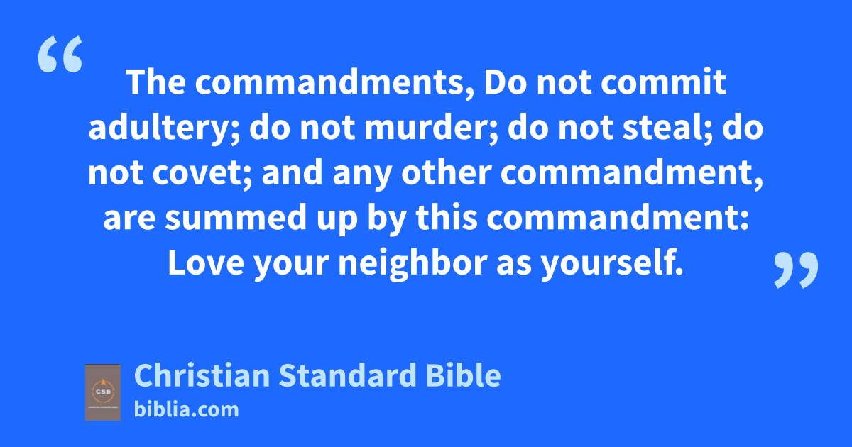 8 Do not owe anyone anything, except to love one another, for the one who loves another has fulfilled the law.aw 9 The commandments, Do not commit adultery; do not murder; do not steal;F do not covet;G,ax and any other commandment, are summed up by this commandment: Love your neighbor as yourself.H,ay 10 Love does no wrong to a neighbor. Love, therefore, is the fulfillment of the law.