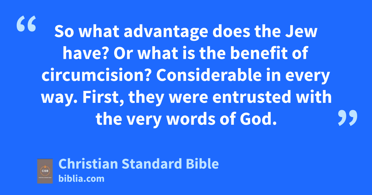 3 So what advantage does the Jew have? Or what is the benefit of circumcision? 2 Considerable in every way. First, they were entrusteda with the very words of God.b 3 What then? If some were unfaithful,c will their unfaithfulness nullify God’s faithfulness? 4 Absolutely not!d Let God be true, even though everyone is a liar,e as it is written: