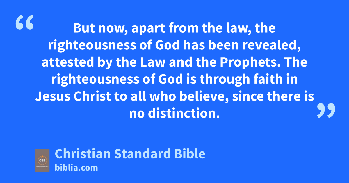 21 But now, apart from the law, the righteousness of God has been revealed,aa attested by the Law and the Prophets.O,ab 22 The righteousness of God is through faithac in Jesus ChristP,ad to all who believe,ae since there is no distinction.af 23 For all have sinnedag and fall short of theQ glory of God; 24 they are justified freely by his graceah through the redemption that is in Christ Jesus.ai 25 God presented him as the mercy seatR,aj by his blood,ak through faith, to demonstrate his righteousness, because in his restraint Godal passed over the sins previously committed.am 26 God presented him to demonstrate his righteousness at the present time, so that he would be just and justify the one who has faith in Jesus.
