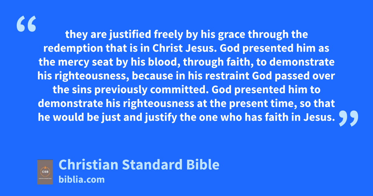 21 But now, apart from the law, the righteousness of God has been revealed,aa attested by the Law and the Prophets.O,ab 22 The righteousness of God is through faithac in Jesus ChristP,ad to all who believe,ae since there is no distinction.af 23 For all have sinnedag and fall short of theQ glory of God; 24 they are justified freely by his graceah through the redemption that is in Christ Jesus.ai 25 God presented him as the mercy seatR,aj by his blood,ak through faith, to demonstrate his righteousness, because in his restraint Godal passed over the sins previously committed.am 26 God presented him to demonstrate his righteousness at the present time, so that he would be just and justify the one who has faith in Jesus.