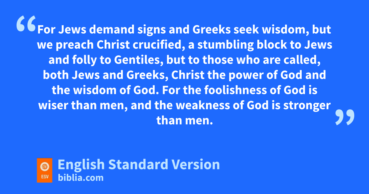 20 gWhere is the one who is wise? Where is the scribe? Where is the debater of this age? hHas not God made foolish the wisdom of the world? 21 For since, in the wisdom of God, the world did not know God through wisdom, it pleased God through the folly of what we preach2 to save those who believe. 22 For iJews demand signs and Greeks seek wisdom, 23 but we preach Christ jcrucified, a stumbling block to Jews and folly to Gentiles, 24 but to those who are called, both Jews and Greeks, Christ kthe power of God and lthe wisdom of God. 25 For the foolishness of God is wiser than men, and the weakness of God is stronger than men.
