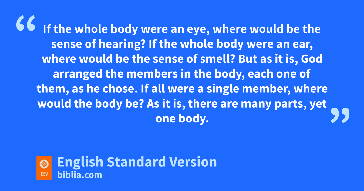 14 For the body does not consist of one member but of many. 15 If the foot should say, “Because I am not a hand, I do not belong to the body,” that would not make it any less a part of the body. 16 And if the ear should say, “Because I am not an eye, I do not belong to the body,” that would not make it any less a part of the body. 17 If the whole body were an eye, where would be the sense of hearing? If the whole body were an ear, where would be the sense of smell? 18 But as it is, nGod arranged the members in the body, each one of them, oas he chose. 19 If all were a single member, where would the body be? 20 As it is, there are many parts,5 yet one body.