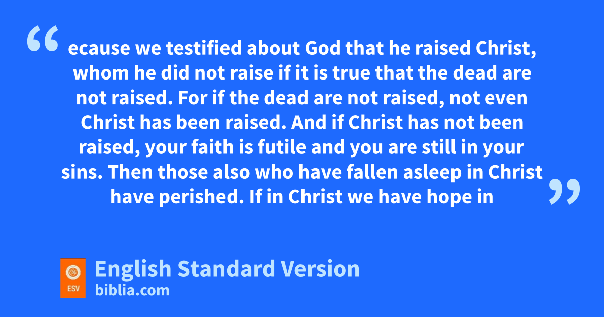 12 Now if Christ is proclaimed as raised from the dead, zhow can some of you say that there is no resurrection of the dead? 13 But if there is no resurrection of the dead, athen not even Christ has been raised. 14 And if Christ has not been raised, then our preaching is in vain and your faith is in vain. 15 We are even found to be misrepresenting God, because we testified about God that bhe raised Christ, whom he did not raise if it is true that the dead are not raised. 16 For if the dead are not raised, not even Christ has been raised. 17 And if Christ has not been raised, your faith is futile and cyou are still in your sins. 18 Then those also who dhave fallen asleep in Christ have perished. 19 If in Christ we have hope2 in this life only, ewe are of all people most to be pitied.