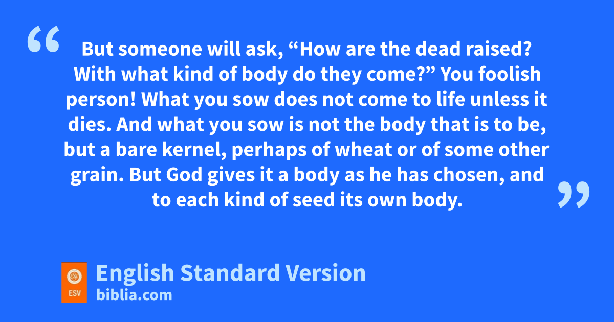 35 But someone will ask, d“How are the dead raised? With what kind of body do they come?” 36 You foolish person! eWhat you sow does not come to life unless it dies. 37 And what you sow is not the body that is to be, but a bare kernel, perhaps of wheat or of some other grain. 38 But God gives it a body as he has chosen, and to each kind of seed its own body. 39 For not all flesh is the same, but there is one kind for humans, another for animals, another for birds, and another for fish. 40 There are heavenly bodies and earthly bodies, but the glory of the heavenly is of one kind, and the glory of the earthly is of another. 41 There is one glory of the sun, and another glory of the moon, and another glory of the stars; for star differs from star in glory.