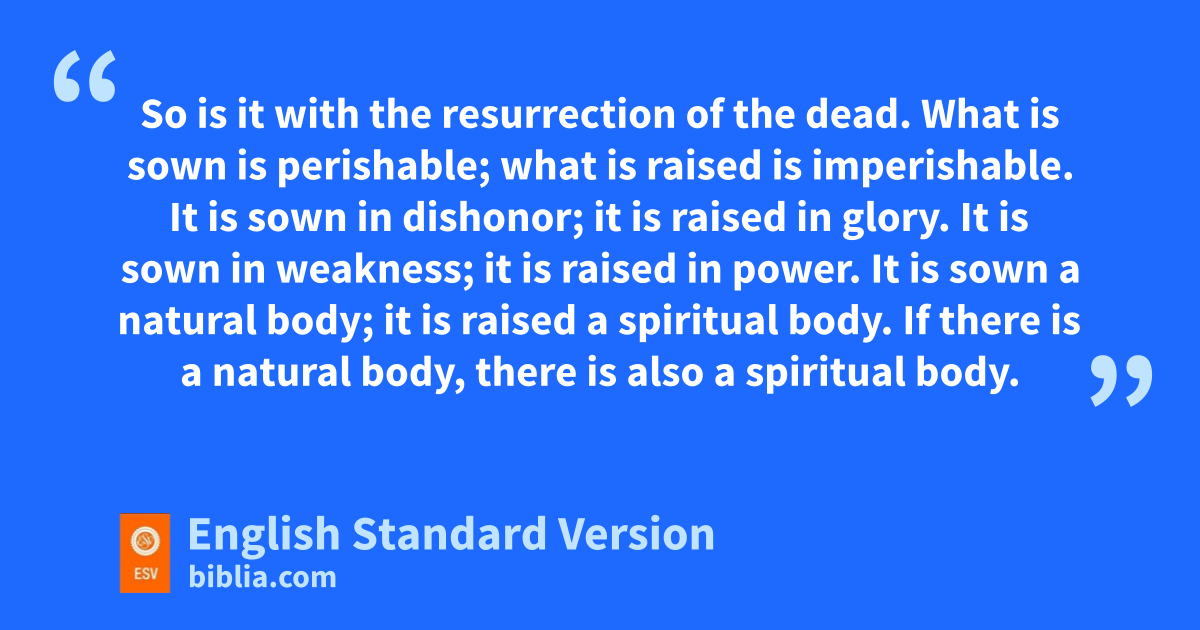 42 fSo is it with the resurrection of the dead. What is sown is perishable; what is raised is imperishable. 43 It is sown in dishonor; git is raised in glory. It is sown in weakness; it is raised in power. 44 It is sown a natural body; it is raised a spiritual body. If there is a natural body, there is also a spiritual body. 45 Thus it is written, h“The first man Adam became a living being”;5 ithe last Adam became a jlife-giving spirit. 46 But it is not the spiritual that is first but the natural, and then the spiritual. 47 kThe first man was from the earth, la man of dust; mthe second man is from heaven. 48 As was the man of dust, so also are those who are of the dust, and as is the man of heaven, nso also are those who are of heaven. 49 Just oas we have borne the image of the man of dust, pwe shall6 also bear the image of the man of heaven.