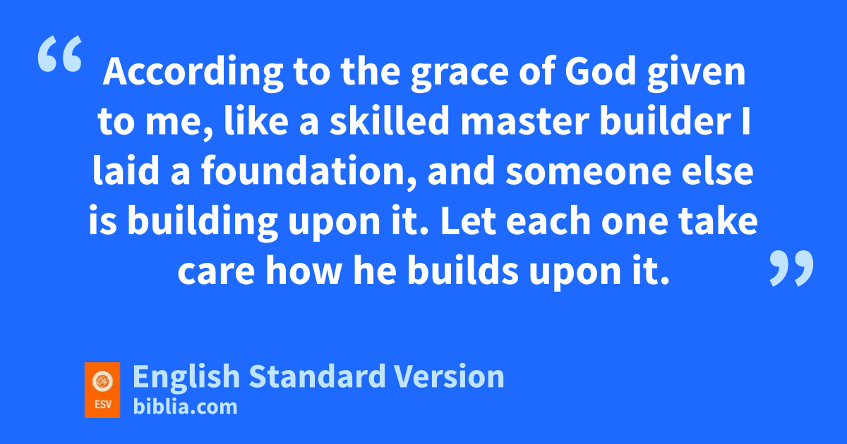 10 rAccording to the grace of God given to me, like a skilled2 master builder I laid a sfoundation, and tsomeone else is building upon it. Let each one take care how he builds upon it. 11 For no one can lay a ufoundation other vthan that which is laid, wwhich is Jesus Christ. 12 Now if anyone builds on the foundation with gold, silver, precious stones, wood, hay, straw— 13 xeach one’s work will become manifest, for the Day will disclose it, because it will be revealed yby fire, and zthe fire will test what sort of work each one has done. 14 If the work that anyone has built on the foundation survives, ahe will receive a reward. 15 If anyone’s work is burned up, he will suffer loss, though he himself will be saved, bbut only as through fire.