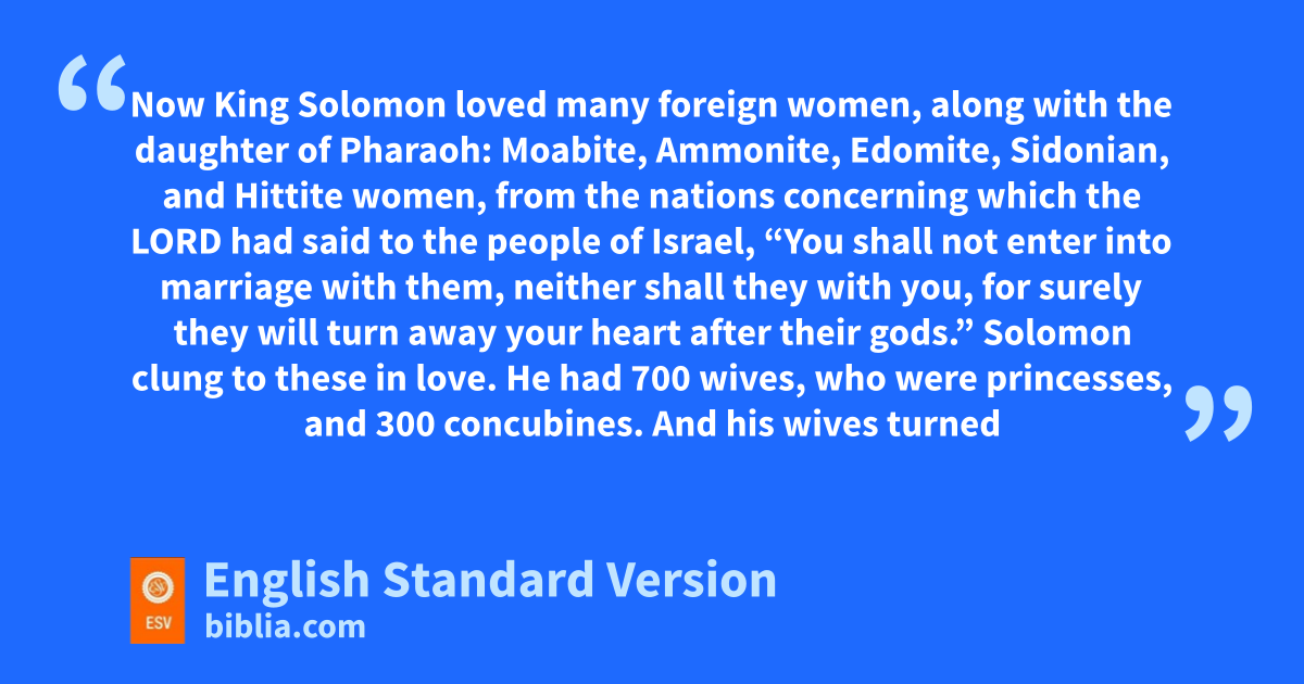 11 Now wKing Solomon loved many foreign women, along with the daughter of Pharaoh: Moabite, Ammonite, Edomite, Sidonian, and Hittite women, 2 from the nations concerning which the Lord had said to the people of Israel, x“You shall not enter into marriage with them, neither shall they with you, for surely they will turn away your heart after their gods.” Solomon clung to these in love. 3 He had 700 wives, who were princesses, and 300 concubines. And his wives turned away his heart. 4 For when Solomon was old his wives turned away his heart after other gods, and yhis heart was not wholly true to the Lord his God, zas was the heart of David his father. 5 For Solomon went after aAshtoreth the goddess of the Sidonians, and after bMilcom the abomination of the Ammonites. 6 So Solomon did what was evil in the sight of the Lord and did not wholly follow the Lord, as David his father had done. 7 Then Solomon built a high place for cChemosh the abomination of Moab, and for dMolech the abomination of the Ammonites, on the mountain east of Jerusalem. 8 And so he did for all his foreign wives, who made offerings and sacrificed to their gods.
