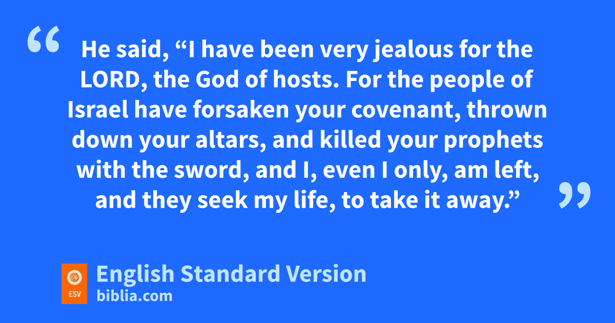 9 There he came to a cave and lodged in it. And behold, wthe word of the Lord came to him, and he said to him, “What are you doing here, Elijah?” 10 He said, “I have been very xjealous for the Lord, the God of hosts. For the people of Israel have forsaken your covenant, ythrown down your altars, and zkilled your prophets with the sword, aand I, even I only, am left, and they seek my life, to take it away.” 11 And he said, “Go out and bstand on the mount before the Lord.” And behold, the Lord passed by, and ca great and strong wind tore the mountains and broke in pieces the rocks before the Lord, but the Lord was not in the wind. And after the wind dan earthquake, but the Lord was not in the earthquake. 12 And after the earthquake a fire, but the Lord was not in the fire. And after the fire the sound of a low whisper.1 13 And when Elijah heard it, ehe wrapped his face in his cloak and went out and stood at the entrance of the cave. And behold, fthere came a voice to him and said, “What are you doing here, Elijah?” 14 He said, x“I have been very jealous for the Lord, the God of hosts. For the people of Israel have forsaken your covenant, ythrown down your altars, and killed your prophets with the sword, and I, even I only, am left, and they seek my life, to take it away.” 15 And the Lord said to him, “Go, return on your way to the wilderness of Damascus. And when you arrive, you shall anoint Hazael to be king over Syria. 16 gAnd Jehu the son of Nimshi you shall anoint to be king over Israel, and hElisha the son of Shaphat of Abel-meholah you shall anoint to be prophet in your place. 17 And the one who escapes from ithe sword of Hazael jshall Jehu put to death, and the one who escapes from the sword of Jehu kshall Elisha put to death. 18 lYet I will leave seven thousand in Israel, all the knees that have not bowed to Baal, and every mouth that has not mkissed him.”