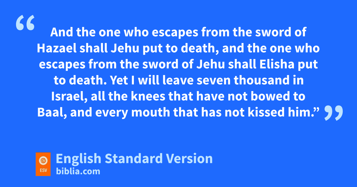 9 There he came to a cave and lodged in it. And behold, wthe word of the Lord came to him, and he said to him, “What are you doing here, Elijah?” 10 He said, “I have been very xjealous for the Lord, the God of hosts. For the people of Israel have forsaken your covenant, ythrown down your altars, and zkilled your prophets with the sword, aand I, even I only, am left, and they seek my life, to take it away.” 11 And he said, “Go out and bstand on the mount before the Lord.” And behold, the Lord passed by, and ca great and strong wind tore the mountains and broke in pieces the rocks before the Lord, but the Lord was not in the wind. And after the wind dan earthquake, but the Lord was not in the earthquake. 12 And after the earthquake a fire, but the Lord was not in the fire. And after the fire the sound of a low whisper.1 13 And when Elijah heard it, ehe wrapped his face in his cloak and went out and stood at the entrance of the cave. And behold, fthere came a voice to him and said, “What are you doing here, Elijah?” 14 He said, x“I have been very jealous for the Lord, the God of hosts. For the people of Israel have forsaken your covenant, ythrown down your altars, and killed your prophets with the sword, and I, even I only, am left, and they seek my life, to take it away.” 15 And the Lord said to him, “Go, return on your way to the wilderness of Damascus. And when you arrive, you shall anoint Hazael to be king over Syria. 16 gAnd Jehu the son of Nimshi you shall anoint to be king over Israel, and hElisha the son of Shaphat of Abel-meholah you shall anoint to be prophet in your place. 17 And the one who escapes from ithe sword of Hazael jshall Jehu put to death, and the one who escapes from the sword of Jehu kshall Elisha put to death. 18 lYet I will leave seven thousand in Israel, all the knees that have not bowed to Baal, and every mouth that has not mkissed him.”
