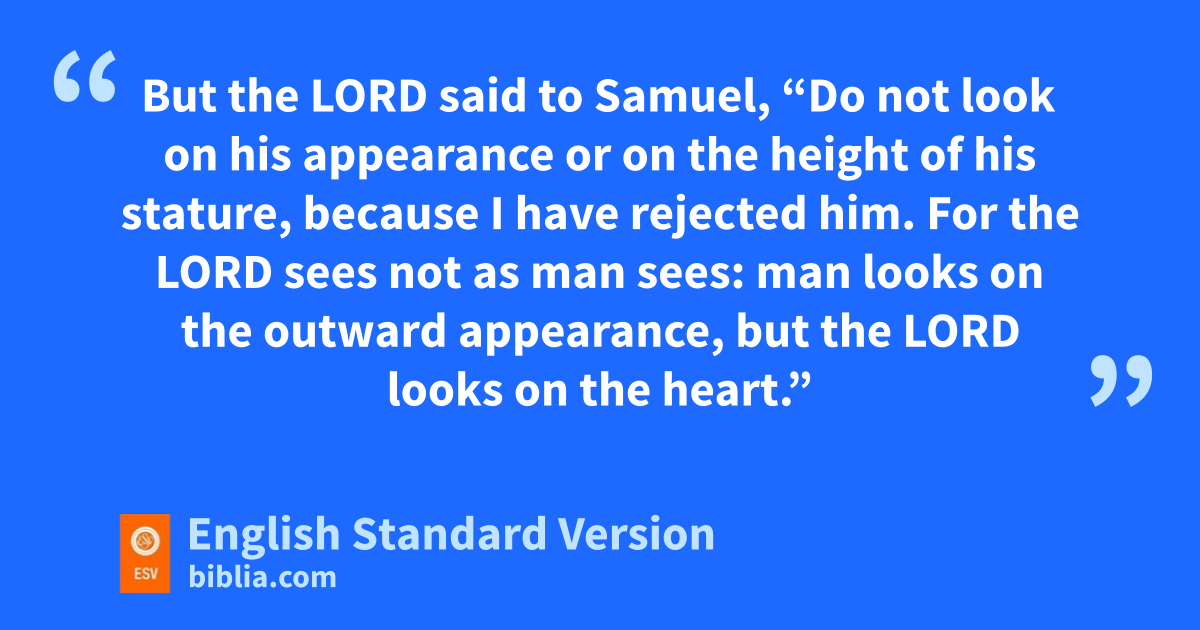 6 When they came, he looked on aEliab and thought, “Surely the Lord’s anointed is before him.” 7 But the Lord said to Samuel, b“Do not look on his appearance or on the height of his stature, because I have rejected him. For the Lord sees not as man sees: man looks on the outward appearance, cbut the Lord looks on the heart.” 8 Then Jesse called dAbinadab and made him pass before Samuel. And he said, “Neither has the Lord chosen this one.” 9 Then Jesse made dShammah pass by. And he said, “Neither has the Lord chosen this one.” 10 And Jesse made seven of his sons pass before Samuel. And Samuel said to Jesse, “The Lord has not chosen these.” 11 Then Samuel said to Jesse, “Are all your sons here?” And he said, e“There remains yet the youngest,1 but behold, he is keeping the sheep.” And Samuel said to Jesse, f“Send and get him, for we will not sit down till he comes here.” 12 And he sent and brought him in. Now he was gruddy and had beautiful eyes and was handsome. And the Lord said, h“Arise, anoint him, for this is he.” 13 Then Samuel took ithe horn of oil jand anointed him in the midst of his brothers. kAnd the Spirit of the Lord rushed upon David from that day forward. And Samuel rose up and went to Ramah.
