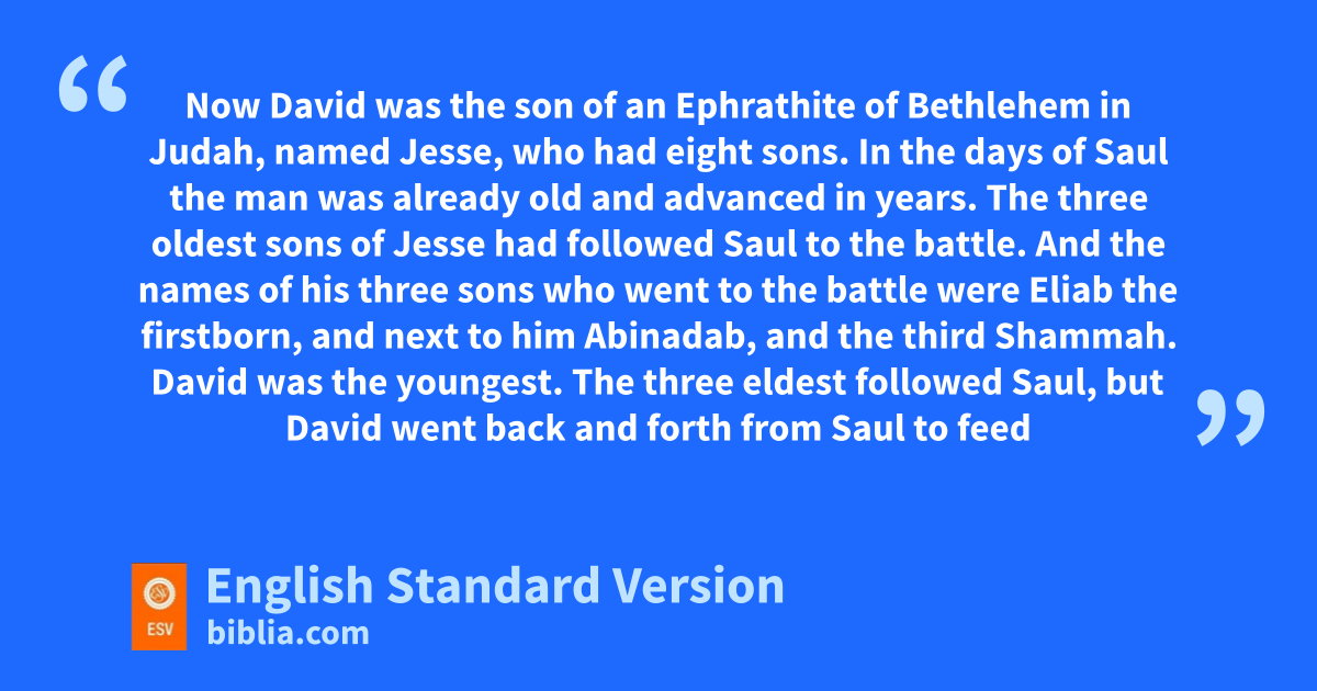 12 Now David was hthe son of an iEphrathite of Bethlehem in Judah, jnamed Jesse, kwho had eight sons. In the days of Saul the man was already old and advanced in years.4 13 The three oldest sons of Jesse had followed Saul to the battle. And lthe names of his three sons who went to the battle were Eliab the firstborn, and next to him Abinadab, and the third Shammah. 14 mDavid was the youngest. The three eldest followed Saul, 15 but David went back and forth from Saul nto feed his father’s sheep at Bethlehem. 16 For forty days the Philistine came forward and took his stand, morning and evening.