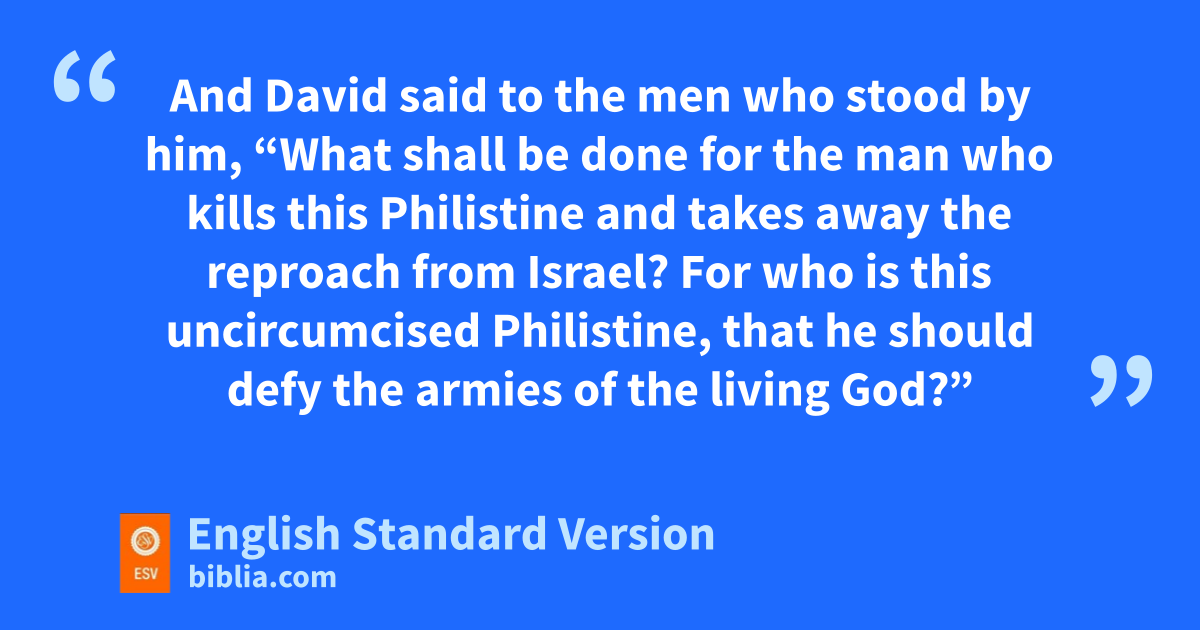 24 All the men of Israel, when they saw the man, fled from him and were much afraid. 25 And the men of Israel said, “Have you seen this man who has come up? Surely he has come up to udefy Israel. And the king will enrich the man who kills him with great riches vand will give him his daughter and make his father’s house free in Israel.” 26 And David said to the men who stood by him, “What shall be done for the man who kills this Philistine and takes away wthe reproach from Israel? For who is this xuncircumcised Philistine, that he should udefy the armies of ythe living God?” 27 And the people answered him in the same way, z“So shall it be done to the man who kills him.”