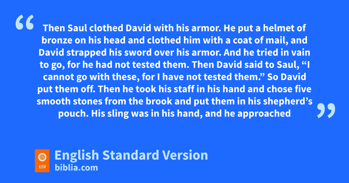 38 Then Saul clothed David with his armor. He put a helmet of bronze on his head and clothed him with a coat of mail, 39 and David strapped his sword over his armor. And he tried in vain to go, for he had not tested them. Then David said to Saul, “I cannot go with these, for I have not tested them.” So David put them off. 40 Then he took his staff in his hand and chose five smooth stones from the brook and put them in his shepherd’s pouch. His sling was in his hand, and he approached the Philistine.