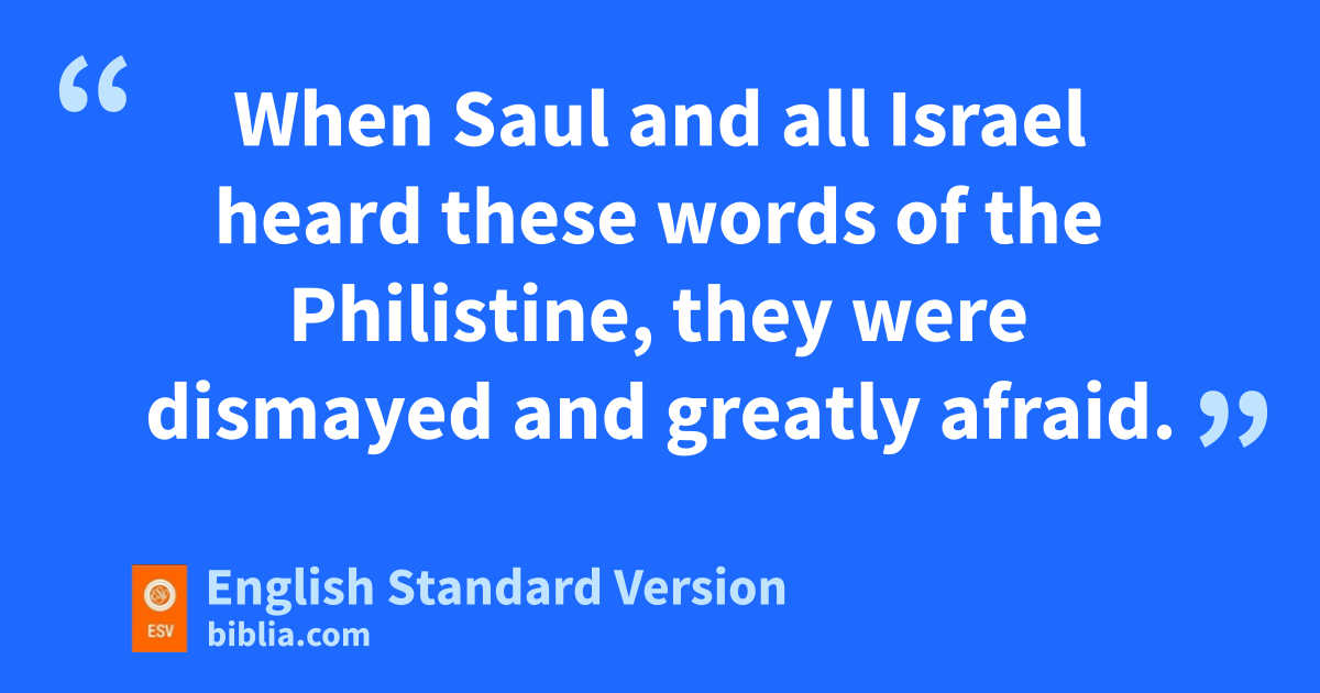 17 Now the Philistines vgathered their armies for battle. And they were gathered at wSocoh, which belongs to Judah, and encamped between Socoh and xAzekah, in yEphes-dammim. 2 And Saul and the men of Israel were gathered, and encamped in zthe Valley of Elah, and drew up in line of battle against the Philistines. 3 And the Philistines stood on the mountain on the one side, and Israel stood on the mountain on the other side, with a valley between them. 4 And there came out from the camp of the Philistines a champion named aGoliath of bGath, whose height was six1 cubits2 and a span. 5 He had a helmet of bronze on his head, and he was armed with a coat of mail, and the weight of the coat was five thousand shekels3 of bronze. 6 And he had bronze armor on his legs, and a cjavelin of bronze slung between his shoulders. 7 The shaft of his spear was like a weaver’s beam, and his spear’s head weighed six hundred shekels of iron. dAnd his shield-bearer went before him. 8 He stood and shouted to the ranks of Israel, “Why have you come out to draw up for battle? Am I not a Philistine, and eare you not servants of Saul? Choose a man for yourselves, and let him come down to me. 9 If he is able to fight with me and kill me, then we will be your servants. But if I prevail against him and kill him, then you shall be our servants fand serve us.” 10 And the Philistine said, g“I defy the ranks of Israel this day. Give me a man, that we may fight together.” 11 When Saul and all Israel heard these words of the Philistine, they were dismayed and greatly afraid.